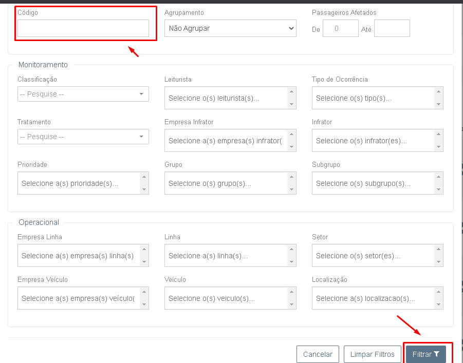 3. Clique no botão Filtros. Digite o número da ocorrência em Código, e logo após em Filtrar.