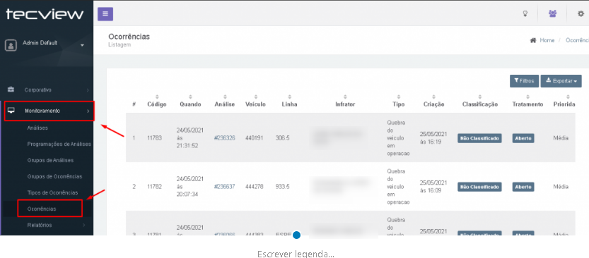 2. Expande a opção Monitoramento, e logo após vá na opção Ocorrências.