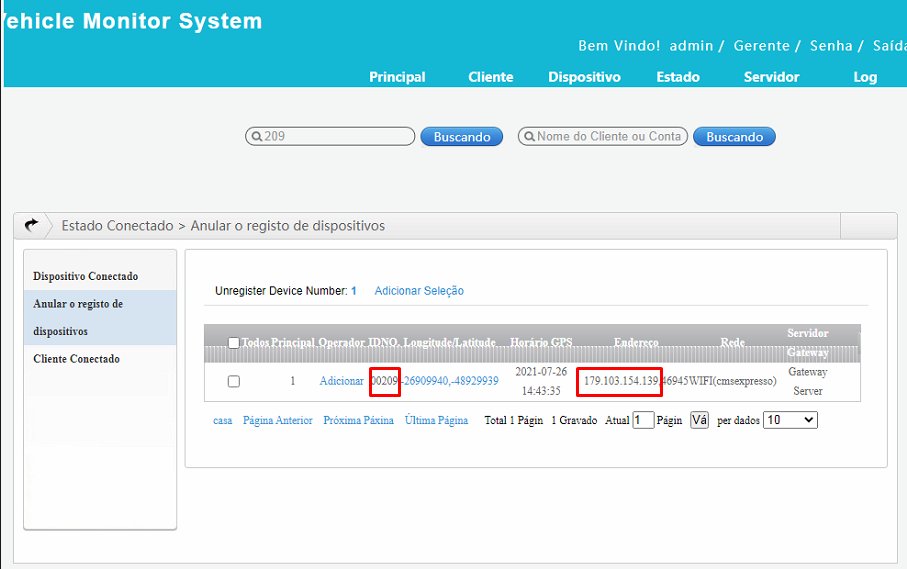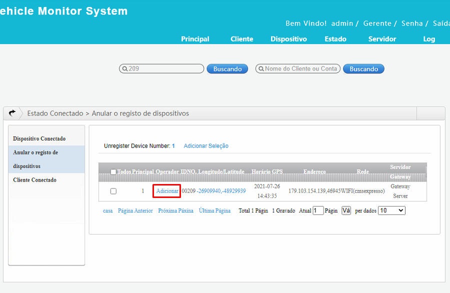 Após identificar o veículo, caso queira adiciona-lo ao Plano de Coletas clique em Unregister Device Number.